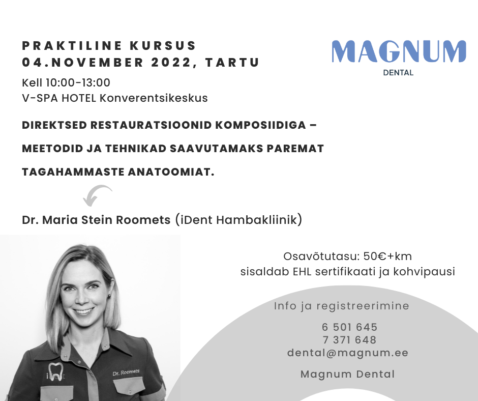 Direktsed restauratsioonid komposiidiga – meetodid ja tehnikad saavutamaks paremat tagahammaste anatoomiat. Tagahammaste taastamine ja kujundamine on hambaarsti praktikas igapäevane tegevus, aga mõnikord võib see olla üsna väljakutsuv. Kursuse peamine eesmärk on aidata hambaarstil oma igapäeva töös saavutada direktsete tööde puhul korratav ja etteaimatav hambaanatoomia, kasutades lihtsaid tehnikaid ning tänapäevaseid materjale. Koolitusel käsitletakse: – direktse restauratsiooni põhietapid, peamised probleemid töö käigus, isolatsioon – kuidas vältida tekkivaid probleeme, millist materjali valida, millist matriitsisüsteemi kasutada – kuidas teostada head oklusaalset anatoomiat – komposiittäidise viimistlemine Tutvustus Dr. Roomets on lõpetanud Tartu Ülikooli stomatoloogia eriala 10 aastat tagasi, 2012 aastal. . Hetkel ta töötab IDent hambaravis ning teostab protseduure hambaravist kuni esteetiliste proteetiliste taastamisteni, juureravist kirurgiani. Kuid töötatud aastate jooksul on ta ikka ja jälle leidnud, et naudib kõige enam tööd komposiidiga – head ja püsivad tulemused, kindlad meetodid ning usaldusväärne materjal. Maria kasutab oma töös mikroskoopi ning digitaalseid hambaravi lahendusi. Kuna dr. Roomets peab väga oluliseks, et patsiendile pakutav ravi oleks teaduspõhine ja kaasaegne, täendab ta end pidevalt nii Eestis kui ka välismaal toimuvatel koolitustel ning viib alati head uued ideed oma kabinetis praktikas ka ellu. Väike väljavõte läbitud täiendkoolitustest: 2022 august, Dr Mindaugas Kudelis, EHP 2022 eelkursus 2022 mai, Soft tissues and restorations. Dr. Ricardo Kern, Vilnius 2022 Dr Dmitri Ruzanov: Implantatsiooni 4-osaline kursus , Tallinn 2022 Didier Dietschi in Tallinn: Tooth Wear, Tallinn 2021 2021 Zero Bone Loss Concepts , Prof. Tomas Linkevičius , Riia 2021 EHP eelkursus, Vertical preparation. Old concept in new approach, dr Alina Ruzanova 2020 veebruar, Reliable adhesive endo-restorative treatment concept – dr Daniel Černý, Eesti Endodontia Selts 2019 Perspectives on occlusal management, Dr.G.Persichetti, Dr.Jacek Gleboki, Dtg Stefano Mariotti, Tomorrow Tooth, Mirabella Eclano, Itaalia 2018 Raising occlusion with diract composite restauration, teoreetiline ja praktiline kursus. Dr. Adomas Auskalnis Tallinn |