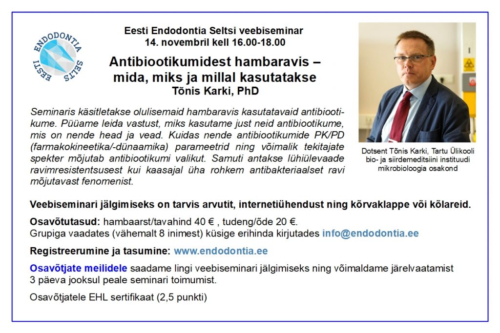 Eesti Endodontia Seltsi veebiseminar “Antibiootikumidest hamba-ravis – mida, miks ja millal kasutatakse?”