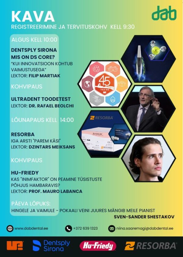 | Registreerumine: | https://www.dabdental.ee/uritused-koolitused/ Kontakt: , +372 58 8766 62 /+372 6 391 323 |